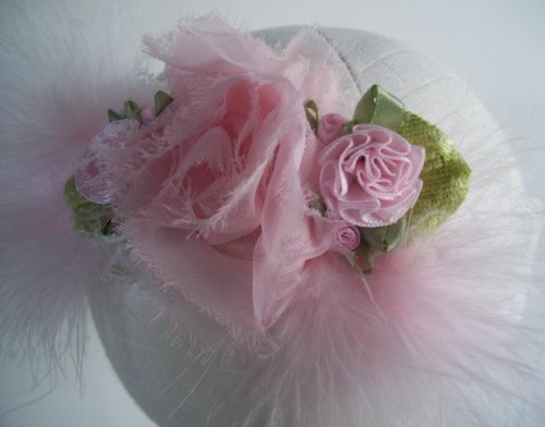 Our delightful Fluffy Pink Roses Headband is so "girly" for your little baby girl! Made from a comfy wide White Lace elastic, it is accented with Fluffy Pink maribou "feathers", sweet Pink chiffon rose, Pink silk ribbon roses, dainty Pink rosebuds and green velvet leaves. So sweet and comfy for baby. This headband has "Vintage Appeal" ~ a bit like a "flapper girl". Designed by Liz MacIntyre for My Baby's Closet and made in USA. Wash - delicate. Read more...