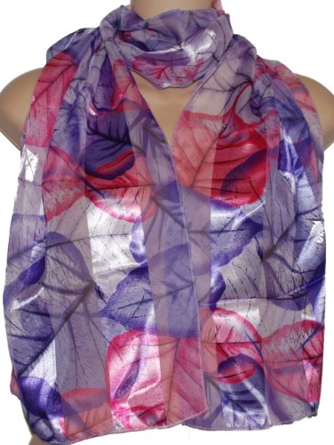 Lavender with pink and purple leaves print scarf. Satin and chiffon stripe, 100% polyester; it measures approx. 13" wide by 60" long. Versatile and inexpensive wardrobe update, use as a belt, scarf, headwrap, or small shawl. Read more...