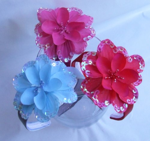 1" satin headband featuring a 4" silk flower with a beaded center. This headband is available in 2 colors. The ends of the headband are wrapped with ribbon for added comfort. Read more...
