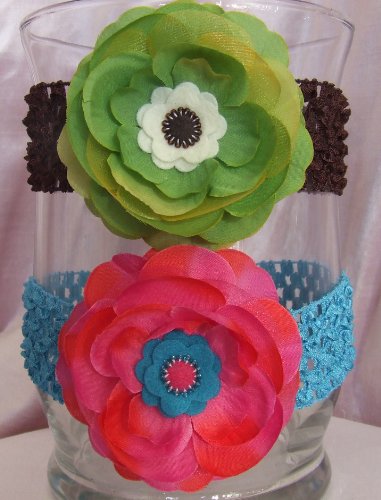 1.5" crochet Baby headband featuring a 3.5" hand layered silk and organza flower. The center of the flower features a 1" felt, beaded flower applique. Available in 3 colors. Read more...