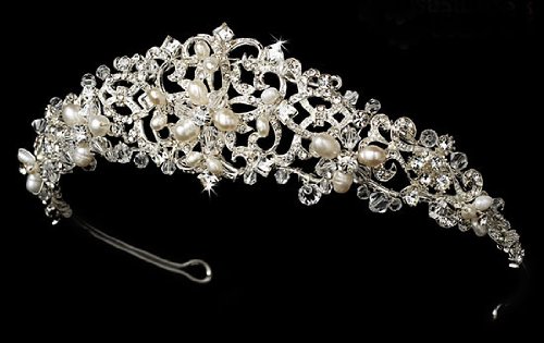 A dazzling tiara with freshwater pearls, Swarovski crystals, and sparkling rhinestones. The tiara decorations measures 7 inches along a sterling silver plated band. The center peak measures 1 1/2 inches tall. Pin loops are at each end of the tiara to securely and comfortably fasten the tiara in your hair. Antique Lace Tiara is timeless and coordinates with any color or style wedding dress, or formal attire. Read more...