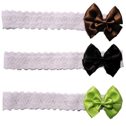 Very Sweet!Soft stretchy lace headbands sized for small infantsSet of three with brown, black and lime green double bows.Five premature infant and newborn baby sizes. By Jacqui's Preemie Pride Read more...